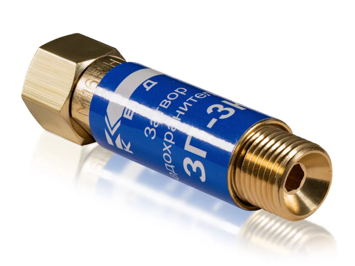 Затвор предохранительный КЕДР ЗП-3К (кислород), на вход резака /горелки, М16х1,5 — предназначен для предотвращения прохождения обратного удара, возникающего при газопламенной обработке металлов, в защищаемое оборудование.