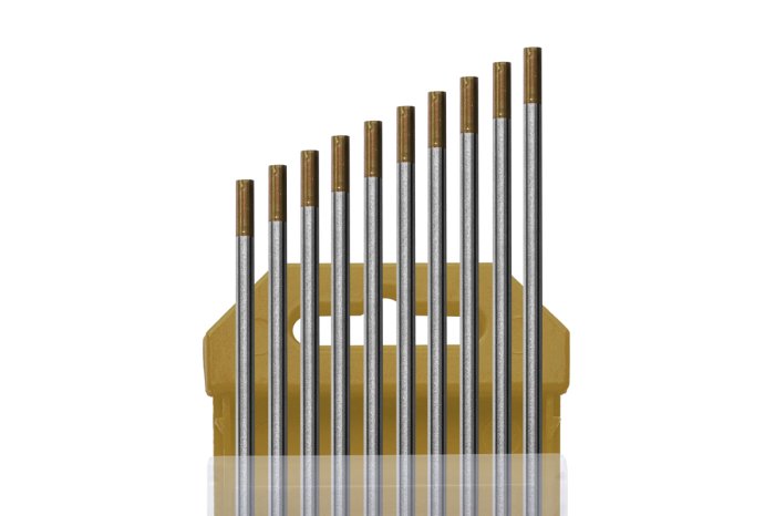 Электроды вольфрамовые WL-15, Ø 3,2 мм, цвет золотистый (цена указана за 1 электрод) из сплава вольфрама с оксидом лантана имеют очень легкий первоначальный запуск дуги, низкую склонность к прожогам, устойчивую дугу и отличную характеристику повторного зажигания дуги.