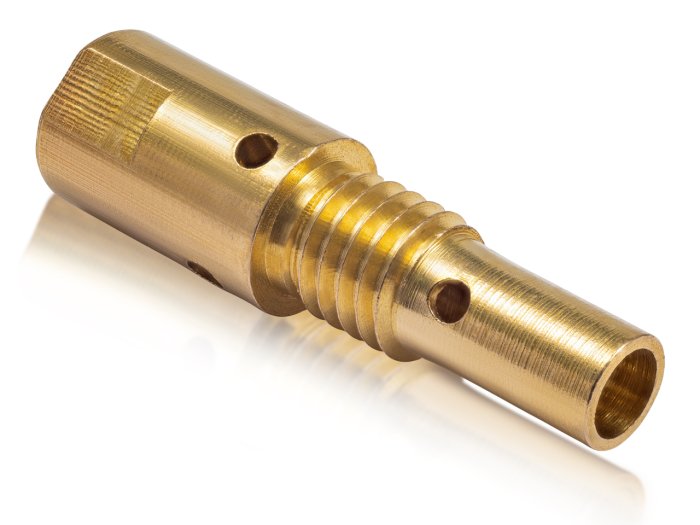 Вставка под наконечник M6/35 мм (Mig-25) - предназначена для монтажа контактного наконечника в горелку. Вставка отвечает за равномерное распределение защитного газа внутри сопла и токоподвод к наконечнику. Все вставки, как правило, выполнены из латуни, имеют симметрично расположенные отверстия по всей окружности. Вставки под наконечник отличаются в зависимости от модели горелки, имеют разные размеры и внешний вид.